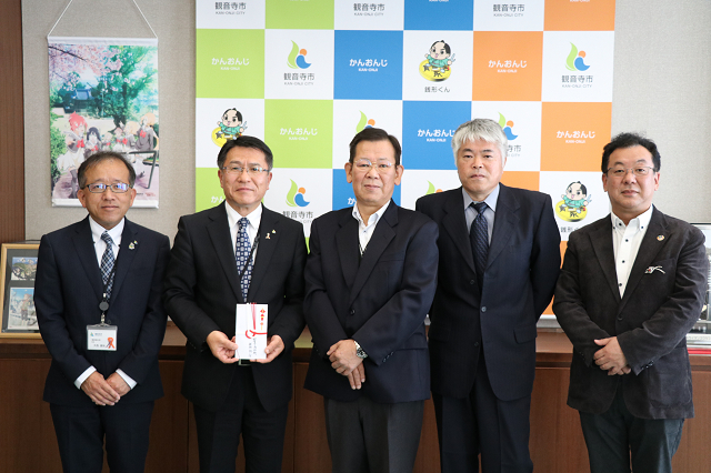 11月15日、観音寺商店街振興組合中塚代表理事が、11月3日に実施した「さぬき食マルシェ」でのチャリティー募金を挽田副市長に手渡しました。義援金は令和元年台風19号に伴う災害で被災された方々を支援するため、日本赤十字社香川県支部へ送られます。