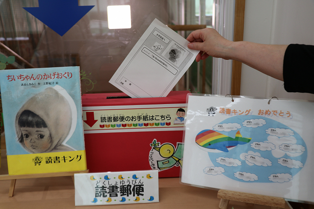 | ▲先生おすすめの本を読んで、感想を伝える読書郵便 | ▲読書フェスティバルで絵本の読み聞かせ発表をする キッズ読み聞かせ隊 |