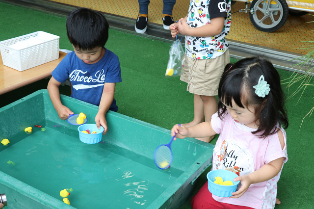 7月6日、豊浜保育所に通う子どもたち92人が、段ボールや色紙で作った焼きそばやジュース、ヨーヨー釣りなど、自分たちで考えた5つのお店が並ぶ縁日ごっこを楽しみました。5歳児10人が店員になり、「いらっしゃいませ」と大きな声でお客を呼び込み大盛況。子どもたちは「黄色いヨーヨーがいい」「赤い金魚がとれたよ」と話しながら、次のお店を回っていました。