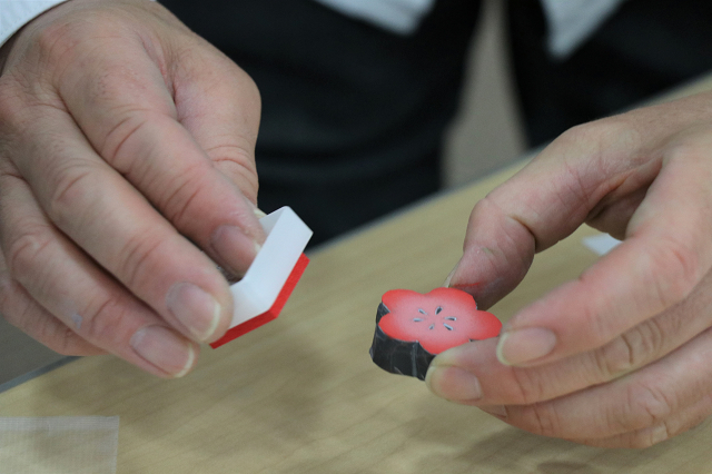 10月25日、中央図書館で大人の図書館ツアー「消しゴム版画の年賀状づくり」を開催し、10人が参加しました。板状の消しゴムを彫って来年の干支「丑(うし)」や松、梅のはんこを作り、版画ならではの温かみのある年賀状を完成させました。参加者は「思った通りの色を出すのが難しい」「初めて参加したが、楽しくできた。家に帰ってからも作りたい」と話していました。
