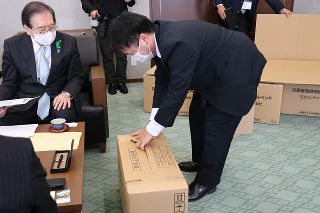 藤原昭夫工場長は「当社の強みは全国で27工場あること。被災した人のストレスの改善や体調管理に役立ててもらえれば」と話すと、白川市長は、「利便性の高い段ボールを提供していただけることは大変心強い」と謝辞を述べました。