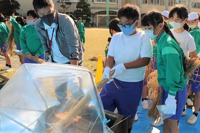 11月4日、大野原小学校5年生89人が校庭で、昔の農具を使って米の脱穀やもみの選別を体験しました。これは、農作業の大変さや農具を開発した先人の知恵を体験してもらおうと、ふるさと学芸館が初めて行った出前授業。児童たちは、バケツで育てた稲を、足踏み脱穀機を使って一人ずつ脱穀し、ふるいでもみを選別した後、すり鉢とボールを使ってもみ殻と玄米を分けるもみすりを行いました。