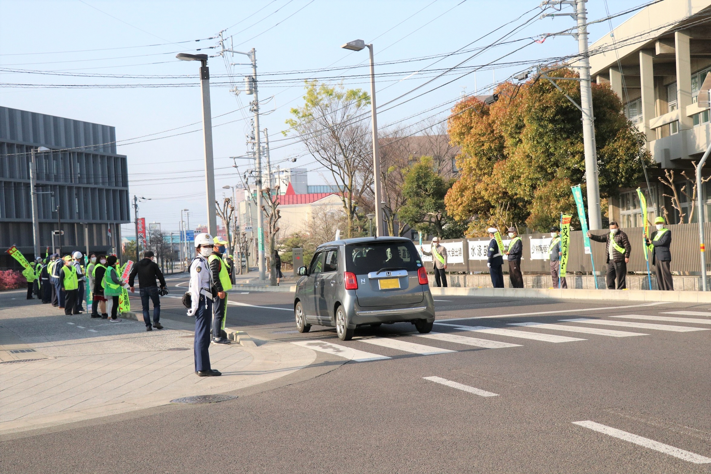 4月8日、交通事故が発生しやすい早朝に市役所前の県道で交通安全キャンペーンを行いました。市交通対策協議会が主催し、市職員や観音寺警察署員、交通安全推進に取り組む市民など約90人が参加。