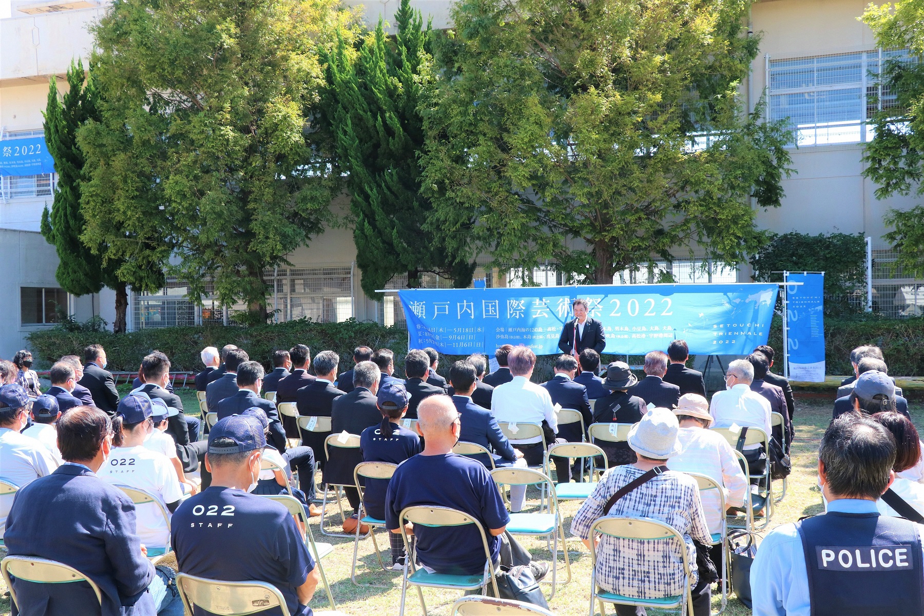 翌30日(金曜日)には、旧伊吹小学校で来賓を招いた記念セレモニーが開かれ、佐伯市長や同芸術祭伊吹島実行委員会の眞鍋信隆会長があいさつしたほか、伊吹小学校児童がアーティストグループ・ゲゲルボヨの6人に花束を贈呈し、感謝の気持ちを伝えました。また、伊吹島出身の和太鼓奏者・三好大地さんが見事な演奏を披露し、開幕を祝いました。