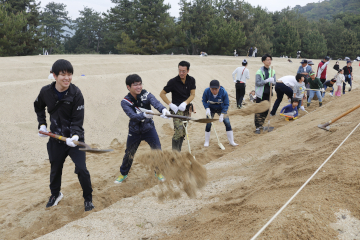 展望台から指示を受けながらスコップで砂をかき上げたり、トンボでならしたりして、砂絵の輪郭が見る見るうちにくっきりと浮かび上がり、美しく整えられた「寛永通宝」が姿を現しました。