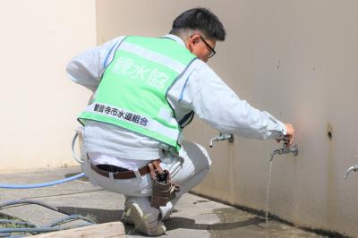 8月22日に市内の水道工事業者で構成する観音寺市上下水道工事業協同組合の青年委員12人が柞田小学校の水道設備を点検しました。地域貢献活動の一環として、8年前から幼稚園や保育所、小学校をボランティアで点検清掃しています。