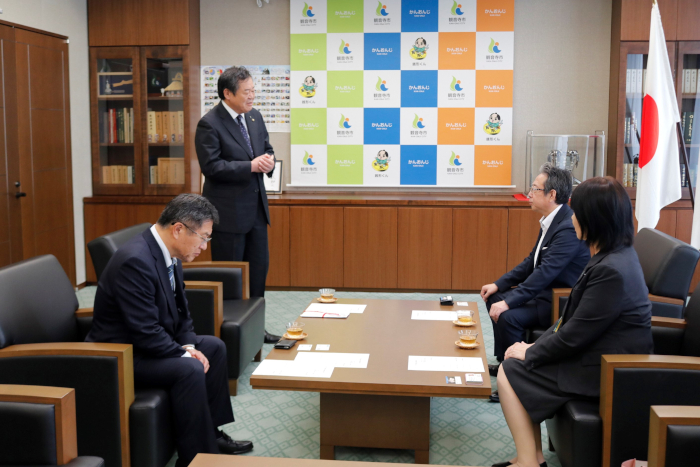 同社高松支社の佐藤祐次観音寺営業所長が「地域の皆さんの健康づくりや暮らしの充実の一助になればと思い寄付をしました。改称したブランド名のとおり、これからも生命保険事業を越えての社会貢献に取り組んでいきたい」と目録を手渡すと、佐伯市長は「子育て支援も市の主要施策の一つで、しっかり進めているところです。昨年に引き続き、ご寄付をいただきありがとうございます」と感謝の言葉を述べ、「元気がなければ企業も地域も発展していかないと思うので、官民交流しながらより良い地域づくりをしていきたい」と話していました。