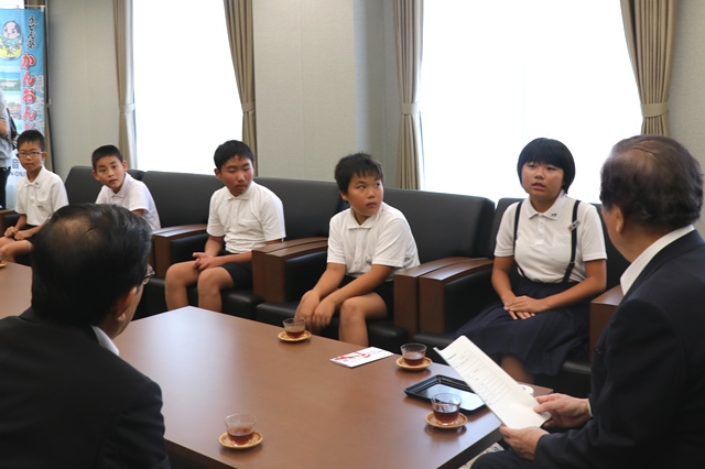 7月28日、豊浜小学校自転車クラブの児童(6年生)が白川市長を表敬訪問し、第51回交通安全子供自転車全国大会に出場することを報告しました。白川市長は「伝統を守り、11年連続29回目の出場を大変うれしく思います。全国大会でも、実力を十分に発揮して頑張ってください」と激励。子どもたちは「県大会での反省を生かして頑張りたい」「本番ではミスをしないようにして1位を目指したい」などと、大会に向けての決意を力強く述べました。練習は週6日、先輩たちも指導に来て応援してくれるそうです。多くの人の声援を受け、本番に臨みます。 (大会は8月3日、東京ビッグサイトで開催)