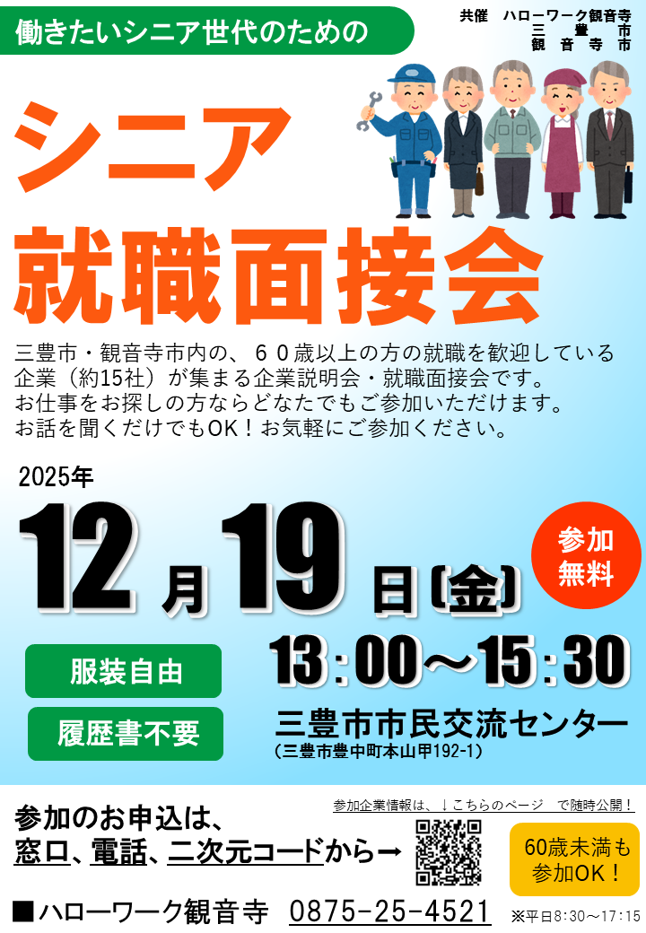 観音寺市・三豊市内の60歳以上の方の就職を歓迎している企業が集まる企業説明会・就職面接会です。「服装自由」「履歴書不要」「お話だけでもOK」です。お気軽にご参加ください。